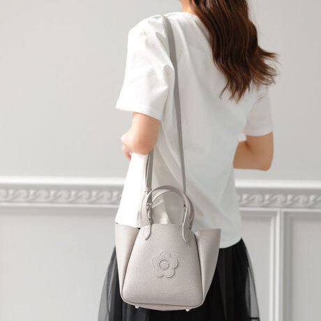 シボ感のあるダブルフェイス合皮を使用したバッグシリーズ。◆シリーズ共通ポイント・裏地がないので軽量・内側のロゴは立体プリント・間口マグネット留め仕様・底びょう付き◆アイテム紹介(2WAYミニトート)・マチが広めで、小さめながら大容量・ころんとしたフォルム・取り外せるショルダーベルトは長さ5段階調節可能なバックルタイプ外側:あおりポケット×2[型番:226-811115]