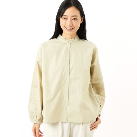 袖に立体モチーフの花柄刺しゅうをあしらった、コットン100%ブラウスです。