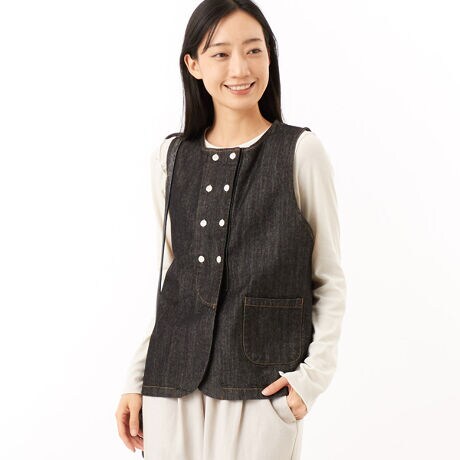 9.2OZタテスラブ入りインディゴデニム/ストライプ ダブル釦前開きベスト