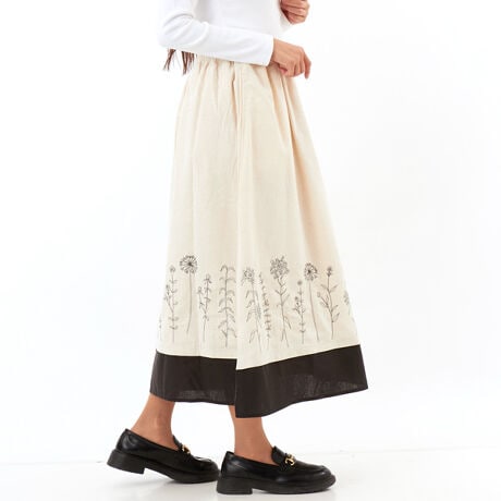 綿麻布帛裾レイヤード風花柄パネル刺しゅう入りスカート