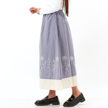 綿麻布帛裾レイヤード風花柄パネル刺しゅう入りスカート
