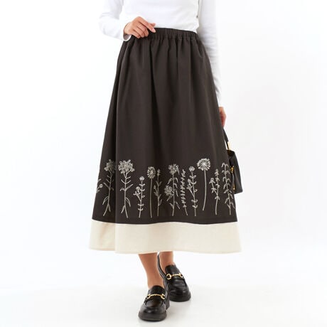 綿麻布帛裾レイヤード風花柄パネル刺しゅう入りスカート