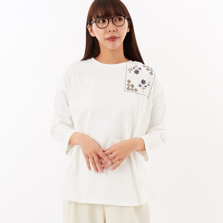 オーガニックコットン天竺左肩部分クロスステッチパネル刺しゅう入りカットソー