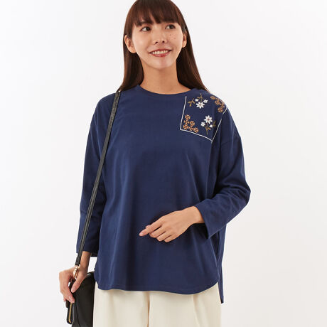 オーガニックコットン天竺左肩部分クロスステッチパネル刺しゅう入りカットソー