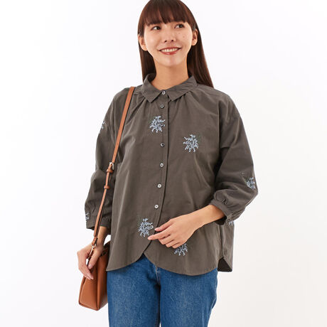 高密度綿ブロード花刺しゅう入り7分袖ブラウス