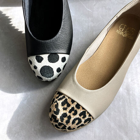 上質な本革をベースに、つま先部分へ異素材を組み合わせたデザインが印象的なバレエパンプス。