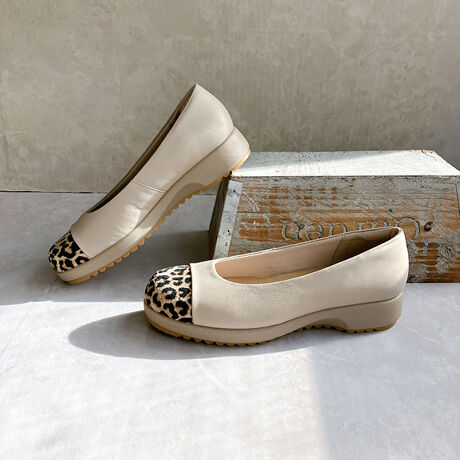 上質な本革をベースに、つま先部分へ異素材を組み合わせたデザインが印象的なバレエパンプス。