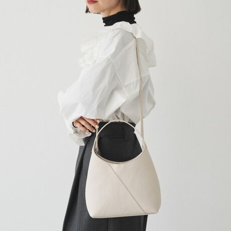 装飾を控えたミニマルな佇まいに、つるりとしたソフトレザーの質感が映えるコンパクトバッグ。