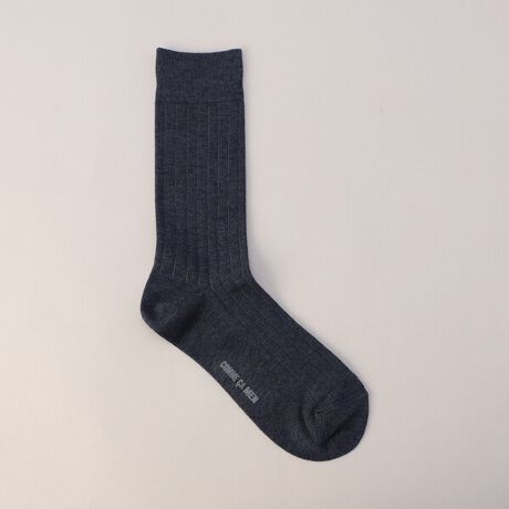 [型番:07-54QO01-206]《デザイン》ベーシックなリブ編みクルーソックスです。新色の杢調のグレーとブルーはデニムなどに相性が良いカジュアルな雰囲気です。締め付けすぎず、緩すぎない適度なフィット感に仕上げたソックスです。《素材》発色の良い綿アクリル糸をベースに使用し裏糸やリブ裏に程よいテンションの、ポリウレタン糸を使用しています。