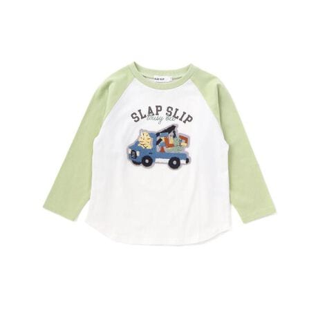 はたらく車に乗った恐竜たちのサガラ刺しゅうが目を引く、男の子用長袖Tシャツ。