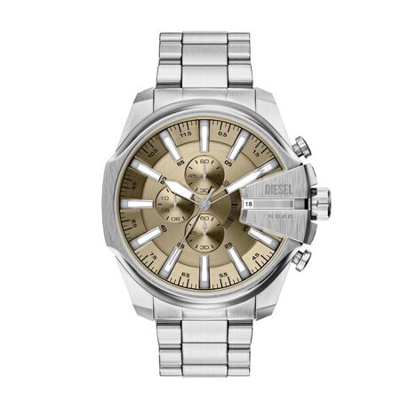48mm径のケースにクロノグラフムーブメントを搭載したDIESELのMEGA CHIEF SLIMウォッチ。ゴールドトーンのサンレイダイヤルに、シルバーのステンレススチール製ブレスレットを組み合わせました。