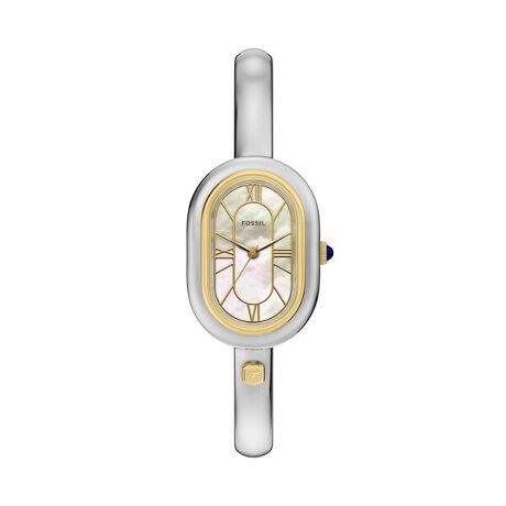 ジュエリーにインスパイアされたツートーンのステンレススチール製バングルブレスレットが、オーバルケースとシームレスに組み合わされ、洗練されたバングルウォッチに仕上がっています。光沢のあるホワイトのマザーオブパールのダイヤルにゴールドトーンの針とインデックスがアクセントを添え、ウォッチの輝くエレガンスとまとまりのあるデザインをさらに引き立てます。バングルブレスレットは、Fossilのシールドロゴが刻印された便利なプッシュボタン留めが特徴で、簡単に着脱できます。