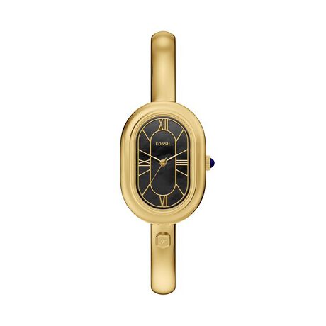 ジュエリーにインスパイアされたゴールドトーンのステンレススチール製バングルブレスレットが、オーバルケースとシームレスに組み合わされ、洗練されたバングルウォッチに仕上がっています。光沢のあるブラックのマザーオブパールのダイヤルにゴールドトーンの針とインデックスがアクセントを添え、ウォッチの輝くエレガンスとまとまりのあるデザインをさらに引き立てます。バングルブレスレットは、Fossilのシールドロゴが刻印された便利なプッシュボタン留めが特徴で、簡単に着脱できます。
