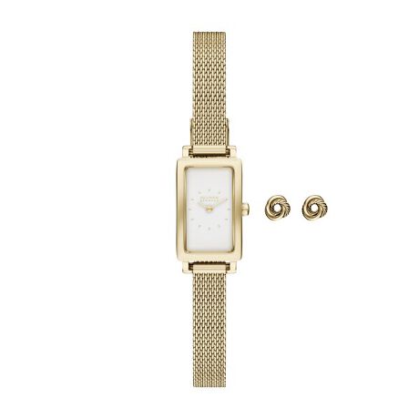 ゴールドトーンのレクタングルケース、サンドブラスト仕上げのホワイトダイアル、ゴールドトーンのステンレススチール製メッシュブレスレットは、メッシュバックル留めで仕上げました。