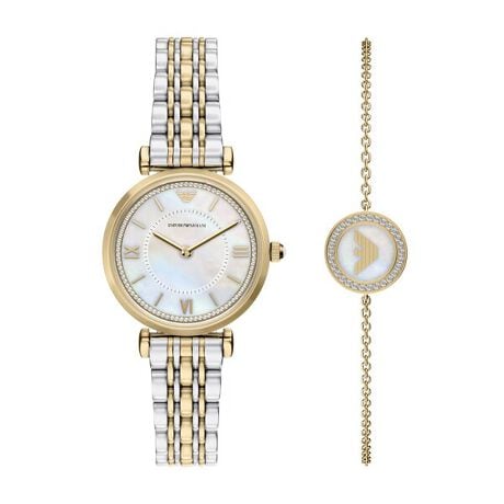 エンポリオ・アルマーニの32mm径ウォッチ。ホワイトマザーオブパールのダイヤルとクリスタルのインレイを施した外縁を組み合わせました。ローマ数字インデックスが、ゴールドトーンステンレススチール製ケースと複雑なツートーンのブレスレットに配されたダイヤルを彩ります。このギフトセットには、可憐なゴールドトーンのジュエリーブレスレットと、マザーオブパールのインレイで囲んだイーグルのロゴチャーム、クリスタルのリングがセットになっています。