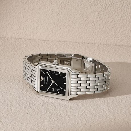 日本製三針デイトムーブメントを搭載した36mm径のレクタングルウォッチ。質感のあるブラックのサンレイダイヤルに、洗練されたステンレススチールのアクセント。7リンクのステンレススチール製ブレスレットを組み合わせたこのウォッチは、あらゆるアンサンブルを格上げするモダンな洗練をもたらします。
