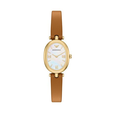 エンポリオ・アルマーニのSINFONIAは、22 x 28mmのウォッチ。ホワイトマザーオブパールのダイヤルにローマ数字インデックスを配し、ゴールドトーンのステンレススチール製ケースにセットしました。ブラウンのレザーストラップと組み合わされ、個性的なオーバルのシルエットがこのウォッチを理想的なアクセサリーにしています。