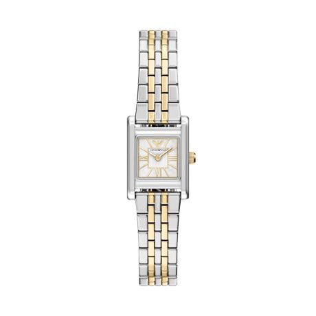 エンポリオ・アルマーニの19 x 26mmのウォッチは、ツートーンステンレススチール製ケースに、光沢のあるマザーオブパールのダイヤルとゴールドトーンのローマ数字インデックスを備えています。ツートーンの5リンクブレスレットにより、このドレスウォッチは、お手持ちのコレクションの中で永遠の魅力を放ちます。