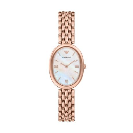 エンポリオ・アルマーニのSINFONIAは、26 x 34mmのウォッチ。ホワイトマザーオブパールのダイヤルにローマ数字インデックスを配し、ポリッシュ仕上げのローズゴールドトーンのステンレススチール製の複数のマルチリンクのブレスレットを組み合わせました。特徴的なオーバルシルエットが、この時計を理想的なドレス アクセサリーにしています。