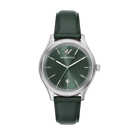 クラシカルなラウンドケース41mm径の三針デイトウォッチは、正確な計時を可能にする日本製ムーブメントを搭載しています。6時位置に日付窓、グリーンのサンレイダイヤル、ステンレススチール製ケースとダークグリーンレザーストラップを配したこのウォッチは、必要なすべてを備え、エフォートレスなスタイルを実現します。