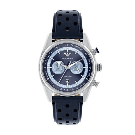 エンポリオ・アルマーニの42mm径ウォッチ。ステンレススチール製ラウンドケース、ダークブルーのサンレイダイヤル、CDテクスチャード仕上げのブライトブルーがアクセントのサブアイを組み合わせました。日本製クロノグラフムーブメントが正確な計時を実現し、機能的なタキメーターが移動距離に対する速度を計測します。パンチングを施したダークブルーのレザーストラップが、スポーツにインスパイアされたこのタイムピースの伝統にオマージュを捧げています。