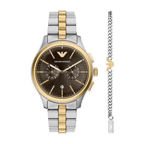 日本製ムーブメントを搭載した、精度と洗練された美しさを併せ持つケース径42mmのクロノグラフウォッチ。二重のサブアイを備えたブラウンのサンレイダイヤルが特徴で、ツートーンのステンレススチール製ブレスレットとマッチするラウンドケースがそれを引き立てます。ゴールドトーンのエンポリオ・アルマーニのイーグルをあしらったステンレススチールのカーブチェーンブレスレットとのセットは、この季節の個性的なギフトに最適です。