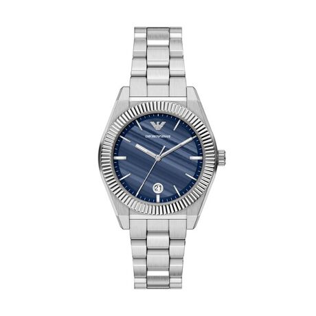 エンポリオ・アルマーニの37mm径ウォッチ。ブルーメテオライトの半貴石ダイヤル、三針日付ムーブメント、ステンレススチール製ブレスレットを組み合わせました。ステンレススチール製フルーテッドベゼルが視覚的な魅力を添えるアクセントとなり、構築的なウォッチケースとブレスレットを見事に引き立てています。