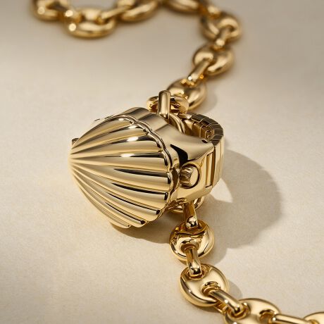 このエレガントなリングウォッチは、ジュエリーの美しさと計時機能を兼ね備えています。ポリッシュ仕上げのゴールドトーンが特徴で、繊細なシェルの蓋を開けるとウォッチフェイスが現れます。ダイヤルには夜光塗料を施したマザーオブパールが使用され、このユニークで身に着けやすいウォッチに、タイムレスなラグジュアリー感を添えています。