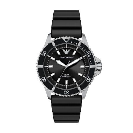 エンポリオ・アルマーニの42mm径ワールドエクスプローラー ソーラーパワー 3針ウォッチ。ブラックのサンレイダイヤル、サファイアクリスタル、ブラックのシリコンストラップを組み合わせました。ソーラー駆動の日本製ムーブメントが信頼性を約束し、頻繁な電池交換を不要にします。この時計は1度のフル充電で最長4ヶ月間使用できます。
