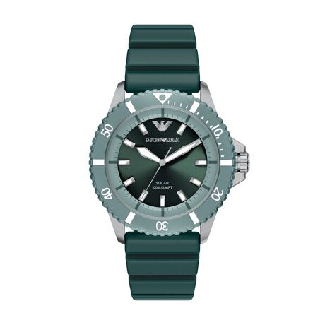 エンポリオ・アルマーニの42mm径ワールドエクスプローラーのサファイアクリスタル付きソーラーパワー三針ウォッチは、この春フレッシュなエネルギーをもたらします。グリーンのサンレイダイアルとシリコンストラップ、バイオプラスチック製ベゼルがアクセントになっています。ソーラー駆動の日本製ムーブメントが信頼性を約束し、頻繁な電池交換を不要にします。この時計は1度のフル充電で最長4ヶ月間使用できます。