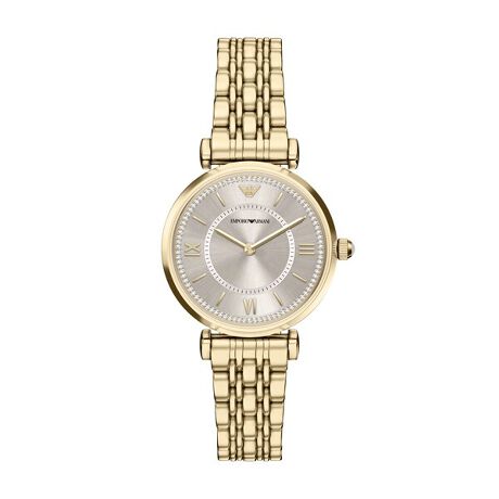 エンポリオ・アルマーニの32mm径ウォッチ。ライトゴールドのサンレイダイヤルとクリスタルのインレイを施した外縁を組み合わせました。ゴールドトーンのローマ数字インデックスが、ゴールドトーンのステンレススチール製ケースと複雑なブレスレットに配されたダイヤルを彩ります。