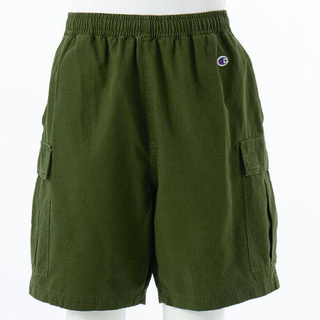 コットンを100%使用した、耐久性のあるコットンリップストップ生地のショーツです。膝上丈で、ワタリと裾口幅にゆとりを持たせたワイドシルエット。両サイドにカーゴポケット付きです。ウエストのスピンドルでサイズ調節可能。バイオウォッシュ加工により、着用の当初から着慣れた風合いが味わえます。右バックポケット口の下に、ボディカラーと同色の手書き風の「Champion(チャンピオン)」の刺繍入りです。