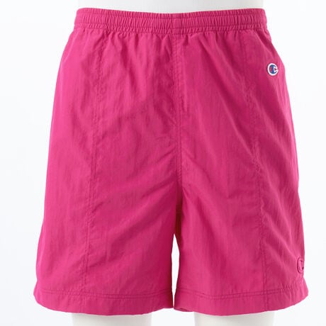 表地はマット調でしわ感のあるナイロン生地、裏地には身生地と同色のメッシュを使用したショーツです。膝上丈で裾口が広く、股上が深いリラックスシルエット。ウエストはスピンドルでサイズ調節できます。両脇と右ヒップにポケット付きで、左前裾にボディカラーと同色の立体的なCロゴ刺繍入り。1990年代を彷彿させるカラー展開です。