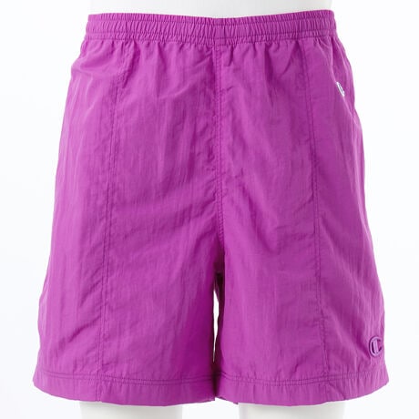 表地はマット調でしわ感のあるナイロン生地、裏地には身生地と同色のメッシュを使用したショーツです。膝上丈で裾口が広く、股上が深いリラックスシルエット。ウエストはスピンドルでサイズ調節できます。両脇と右ヒップにポケット付きで、左前裾にボディカラーと同色の立体的なCロゴ刺繍入り。1990年代を彷彿させるカラー展開です。