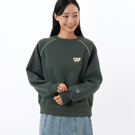 環境に配慮されたリサイクルポリエステルを使用したポンチ素材のクルーネックスウェットシャツです。軽量でストレッチ性に優れ、コットンのような柔らかい肌触りが特長。通気性、保温性も高く、しわにもなりにくいので、着心地が良く、ルームウェアにも適しています。ラグランスリーブで身幅にゆとりを持たせたリラックスフィット。両肩のビビッドなカラーのパイピングと、その色に合わせて左胸に入れたハート型とChampion(チャンピオン)ロゴの刺繍がデザインポイントです。