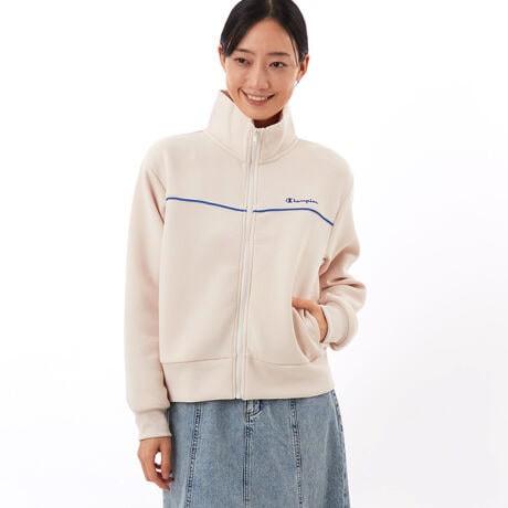環境に配慮されたリサイクルポリエステルを使用したポンチ素材のジップスウェットカーディガンです。軽量でストレッチ性に優れ、コットンのような柔らかい肌触りが特長。通気性、保温性も高く、しわにもなりにくいので、着心地が良く、ルームウェアにも適しています。身幅にゆとりを持たせたリラックスフィット。胸の切り替えのビビッドなカラーのパイピングと、その色に合わせて左胸に入れたChampion(チャンピオン)ロゴ刺繍がデザインポイントです。