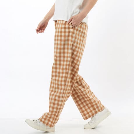 ポリエステルと植物由来のレーヨンの混紡生地を使用したロングパンツです。フルレングスで腰から裾にかけて少し広がりを持たせたストレートシルエット。ストレッチ性もあるのでストレスなく着用できます。ウエストはスピンドルでサイズ調節可能で、両脇にポケット付き。四つ穴ボタン付きの飾り前立てがデザインポイントです。展開色ごとに異なる柄を採用したカラーバリエーション。「二浴染め」という手法により縦糸を染め残すことで全体的に色褪せたような印象を加え、ヴィンテージテイストを演出しています。