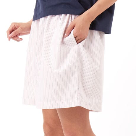 ポリエステルと植物由来のレーヨンの混紡生地を使用したショーツです。ウエスト部分にギャザーを入れることで生まれた、ふんわりとボリュームのあるシルエット。ストレッチ性も備えており、ストレスなく着用できます。ウエストはスピンドルでサイズ調節可能で、両脇にポケット付き。四つ穴ボタン付きの飾り前立てがデザインポイントです。展開色ごとに異なる柄を採用したカラーバリエーション。「二浴染め」という手法により縦糸を染め残すことで、全体に色褪せたような印象を加え、ヴィンテージテイストを演出しています。