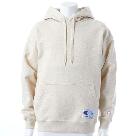 環境に配慮して生産されたサステナブルなアメリカ綿とリサイクルポリエステルを使用。表面を高密度に編み立てることで適度なハリとコシを備え、型くずれしにくく、着こむほどに肌に馴染む裏毛素材のフーデッドスウェットシャツです。大きくゆとりを持たせた身幅、肩幅、袖幅に対し、着丈をやや短めにして着用時のシルエットのバランスをとった、ACTION STYLE(アクションスタイル)独自のサイジングのルーズフィットです。「CONE HOODIE(コーンフーディー)」と呼ばれる大型で先の尖ったフード形状が、デザインにアクセントを添えています。左胸にボディカラーと同色のChampionロゴ刺繍入り。袖口の立体的なCロゴ刺繍もポイントです。フロントの大きめのカンガルーポケット上にジョックタグ付き。