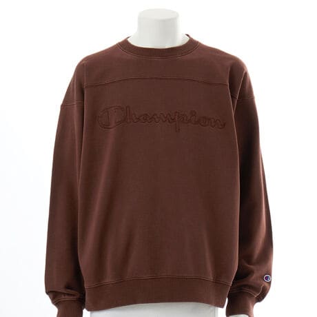 ドライで適度なハリとコシのあるコットン100%の裏毛素材を使用したクルーネックスウェットシャツです。ショルダーヨークの切り替え入りで、大きくゆとりを持たせた身幅、肩幅、袖幅に対し、着丈をやや短めにして着用時のシルエットのバランスをとった、ACTION STYLE(アクションスタイル)独自のサイジングのルーズフィットです。ユーズド感を持たせる加工により、長く愛用してきたようなムラのある色合いを出しています。胸にはボディカラーと同色の縁取りデザインのChampionロゴ刺繍入りです。