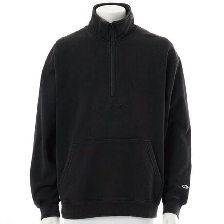 ドライで適度なハリとコシのあるコットン100%の裏毛素材を使用したハーフジップスウェットシャツです。大きくゆとりを持たせた身幅、肩幅、袖幅に対し、着丈をやや短めにして着用時のシルエットのバランスをとった、ACTION STYLE(アクションスタイル)独自のサイジングのルーズフィットです。ユーズド感を持たせる加工により、長く愛用してきたようなムラのある色合いを出しています。胸にはボディカラーと同色の縁取りデザインのChampionロゴ刺繍入りです。