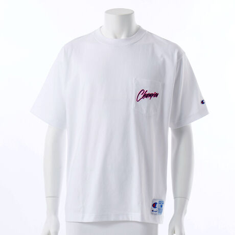 環境に配慮して生産されたサステナブルなアメリカ綿を100%使用した、ドライな着心地のショートスリーブポケットTシャツです。ゆとりを持たせた身幅、肩幅、袖幅に対し、着丈をやや短めにして着用時のシルエットのバランスをとった、ACTION STYLE(アクションスタイル)独自のサイジングのリラックスフィット。製品洗い加工により、着用の当初から着慣れた風合いが味わえます。左胸のポケット上と背中には、手書き風の「Champion(チャンピオン)」をスプレーで縁取ったようなグラフィック入り。左胸の「Champion」は刺繍、背中の「Champion」は発泡プリントで、スプレー風の縁取りはラバープリントです。襟内側にChampionロゴ入りのテープを貼って襟ぐりの補強を行うと同時に、デザインにアクセントを添えています。裾にはジョックタグ付きです。