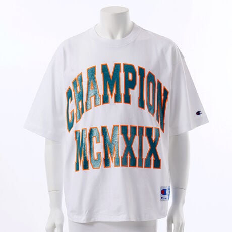 環境に配慮して生産されたサステナブルなアメリカ綿を100%使用した、ドライな着心地のショートスリーブTシャツです。身幅、肩幅、袖幅に大きくゆとりを持たせたACTION STYLE(アクションスタイル)独自のサイジングのルーズフィット、裾は前後の丈に差を付けたラウンドカット仕様です。製品洗い加工により、着用の当初から着慣れた風合いが味わえます。胸にはアーチ型に組んだ「CHAMPION(チャンピオン)」とブランドの創設年である1919年のローマ数字表記「MCMXIX」を組み合わせた大型のグラフィック入り。ラメ入りのグリッタープリントによる文字を、別色のラバープリントで縁取っています。襟内側にChampionロゴ入りのテープを貼って襟ぐりの補強を行うと同時に、デザインにアクセントを添えています。裾にはジョックタグ付きです。