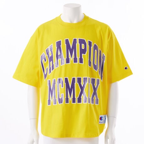 環境に配慮して生産されたサステナブルなアメリカ綿を100%使用した、ドライな着心地のショートスリーブTシャツです。身幅、肩幅、袖幅に大きくゆとりを持たせたACTION STYLE(アクションスタイル)独自のサイジングのルーズフィット、裾は前後の丈に差を付けたラウンドカット仕様です。製品洗い加工により、着用の当初から着慣れた風合いが味わえます。胸にはアーチ型に組んだ「CHAMPION(チャンピオン)」とブランドの創設年である1919年のローマ数字表記「MCMXIX」を組み合わせた大型のグラフィック入り。ラメ入りのグリッタープリントによる文字を、別色のラバープリントで縁取っています。襟内側にChampionロゴ入りのテープを貼って襟ぐりの補強を行うと同時に、デザインにアクセントを添えています。裾にはジョックタグ付きです。