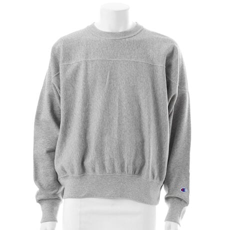 チャンピオンを代表する製法の「REVERSE WEAVE(R)(リバースウィーブ(R))」。環境に配慮して生産されたサステナブルなアメリカ綿100%の、柔らかい手触りで着やすい裏毛素材を使用した「REVERSE WEAVE(R) 10oz. French Terry(リバースウィーブ(R) 10オンス フレンチテリー)」シリーズのクルーネックスウェットシャツです。本来は縦方向に使われる生地を横方向に使用する「REVERSE WEAVE(R)」製法によって縦の生地の縮みを防ぐと同時に、両脇に「EXPANSION GUSSET(エクスパンションガゼット)」を付けることで横の縮みへの影響を少なくし、動きやすさに配慮しています。「REVERSE WEAVE(R)」製法特有の肩接ぎのないカッティングに加え、首周りから両襟ぐりの上半分にかけて一枚の生地で切り替え、ショルダーラインを落としたデザインが特徴的。袖の後ろ部分に切り替えを設け、横から見た際のアクセントとしています。身幅にゆとりを持たせたルーズフィット。着丈がやや短めのスッキリとしたシルエットです。