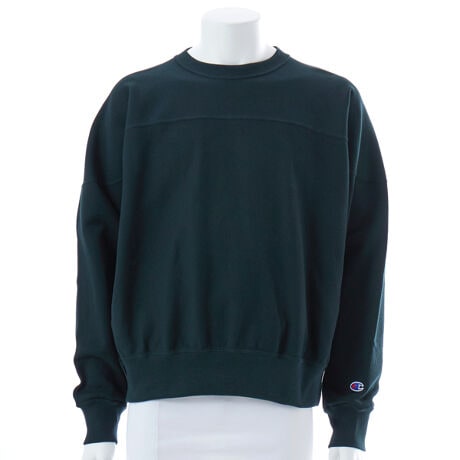 チャンピオンを代表する製法の「REVERSE WEAVE(R)(リバースウィーブ(R))」。環境に配慮して生産されたサステナブルなアメリカ綿100%の、柔らかい手触りで着やすい裏毛素材を使用した「REVERSE WEAVE(R) 10oz. French Terry(リバースウィーブ(R) 10オンス フレンチテリー)」シリーズのクルーネックスウェットシャツです。本来は縦方向に使われる生地を横方向に使用する「REVERSE WEAVE(R)」製法によって縦の生地の縮みを防ぐと同時に、両脇に「EXPANSION GUSSET(エクスパンションガゼット)」を付けることで横の縮みへの影響を少なくし、動きやすさに配慮しています。「REVERSE WEAVE(R)」製法特有の肩接ぎのないカッティングに加え、首周りから両襟ぐりの上半分にかけて一枚の生地で切り替え、ショルダーラインを落としたデザインが特徴的。袖の後ろ部分に切り替えを設け、横から見た際のアクセントとしています。身幅にゆとりを持たせたルーズフィット。着丈がやや短めのスッキリとしたシルエットです。
