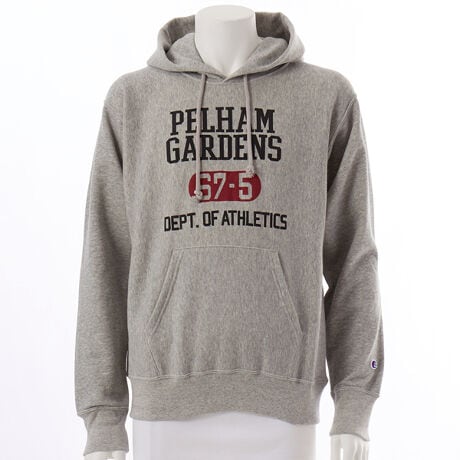チャンピオンを代表する製法の「REVERSE WEAVE(R)(リバースウィーブ(R))」。環境に配慮して生産されたサステナブルなアメリカ綿100%の、柔らかい手触りで着やすい裏毛素材を使用した「REVERSE WEAVE(R) 10oz. French Terry(リバースウィーブ(R) 10オンス フレンチテリー)」シリーズのフーデッドスウェットシャツです。本来は縦方向に使われる生地を横方向に使用する「REVERSE WEAVE(R)」製法によって縦の生地の縮みを防ぐと同時に、両脇に「EXPANSION GUSSET(エクスパンションガゼット)」を付けることで横の縮みへの影響を少なくし、動きやすさに配慮しています。身幅にゆとりを持たせたリラックスフィット。胸のプリントはチャンピオンブランドと親和性の高いカレッジ風グラフィックを現代に落とし込んだもので、アメリカの地名がモチーフ。