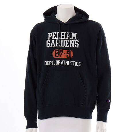 チャンピオンを代表する製法の「REVERSE WEAVE(R)(リバースウィーブ(R))」。環境に配慮して生産されたサステナブルなアメリカ綿100%の、柔らかい手触りで着やすい裏毛素材を使用した「REVERSE WEAVE(R) 10oz. French Terry(リバースウィーブ(R) 10オンス フレンチテリー)」シリーズのフーデッドスウェットシャツです。本来は縦方向に使われる生地を横方向に使用する「REVERSE WEAVE(R)」製法によって縦の生地の縮みを防ぐと同時に、両脇に「EXPANSION GUSSET(エクスパンションガゼット)」を付けることで横の縮みへの影響を少なくし、動きやすさに配慮しています。身幅にゆとりを持たせたリラックスフィット。胸のプリントはチャンピオンブランドと親和性の高いカレッジ風グラフィックを現代に落とし込んだもので、アメリカの地名がモチーフ。
