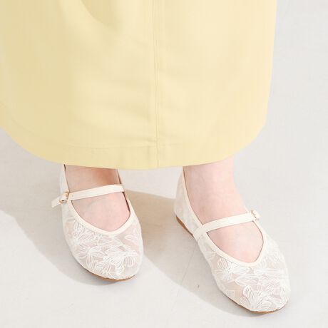 軽やかなチュール素材に可愛らしい花柄刺繍をあしらったメリージェーンパンプス。
