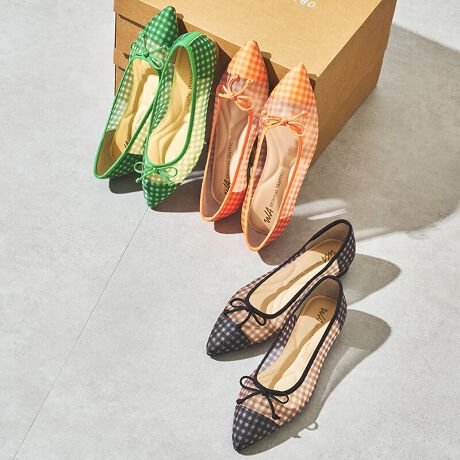 チュール素材×ギンガムチェックを組み合わせた可愛らしいバレエシューズ。つま先は細めのポインテッドトゥで足元をきれいに見せ、アッパーには細めのリボンを施し、大人の女性でも楽しめるデザイン。インソールには凹凸のある仕様を採用し、足裏にフィットして快適な履き心地をサポート。ソックス合わせで早い時期から取り入れられるのが嬉しい。【オススメPOINT】●厚手クッション入り サンプルにて撮影をしておりますので、中敷色、ロゴ色、裏地の色の仕様に変更がある場合がございます。あらかじめご了承ください。